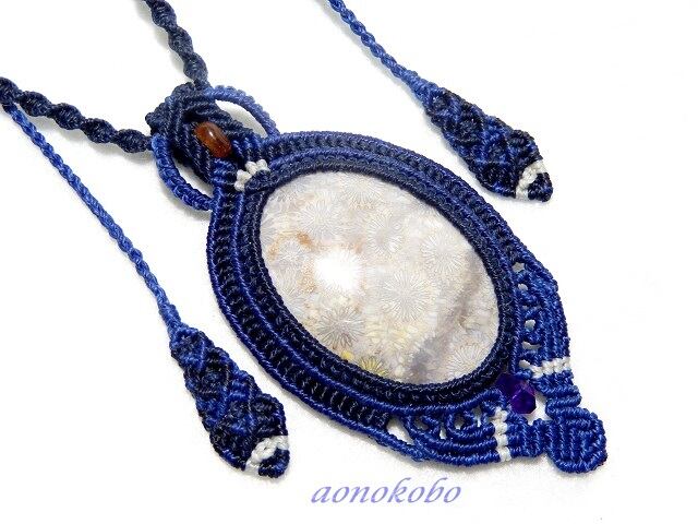 フォッシルコーラルといえばベージュや茶色が多いのですが、白っぽいグレーの色合いの石があり、マクラメでペンダントトップに仕上げてみました。