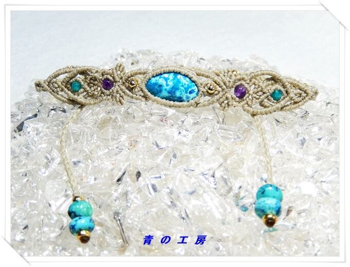 アクセントにアメジストビーズ、ロシアンアマゾナイトビーズ、14Kgfビーズ、クリソコラロンデルビーズを使い、0.5ミリコードで編み上げてあります。