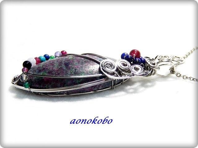 インド産のルビーインフックサイト、(先日研磨したものです)を使って、ワイヤーでペンダントを作りました。